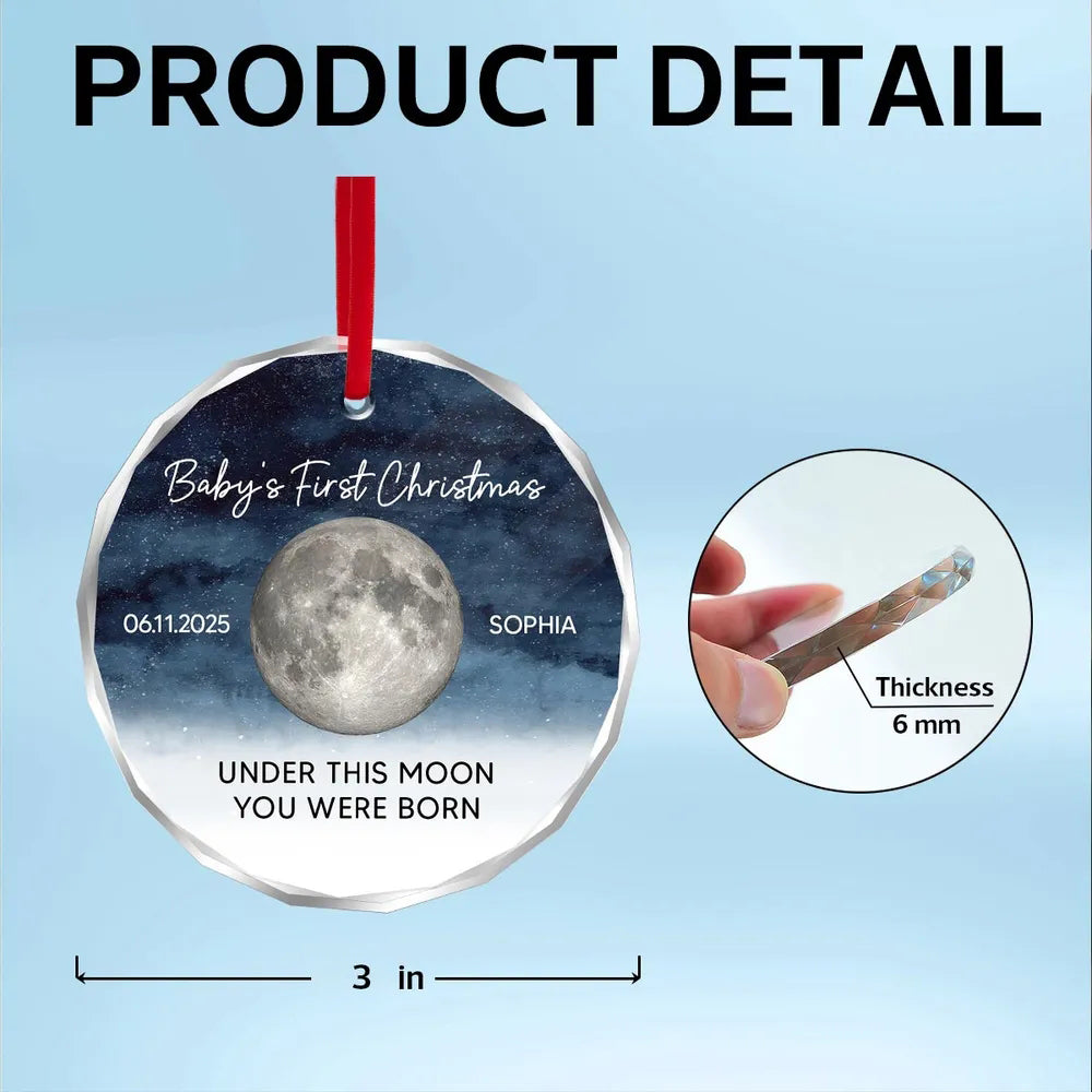 The design pairs a luminous moon with subtle stars, echoing the gentle sentiments of “Baby’s First Christmas / Under This Moon You Were Born.” Faceted edges catch the fairy lights, turning a small ornament into a warm memory of new beginnings.