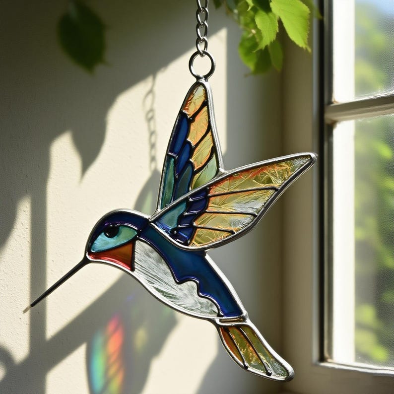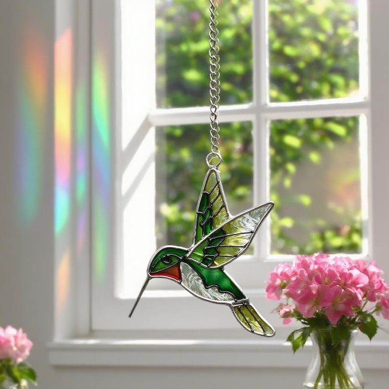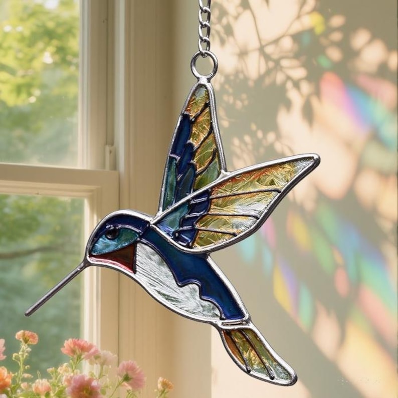 Each piece is carefully made with vibrant stained glass that catches the sunlight and transforms it into a dazzling spectrum of colors — just like the fleeting beauty of a hummingbird in flight.
