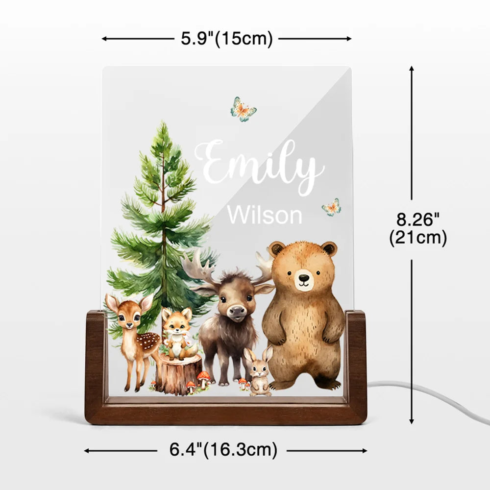 Personalized Cute Deer Fox Forest Animals Acrylic LED Night Light with Wooden Base and Name Birthday Anniversary Gift for Family Children