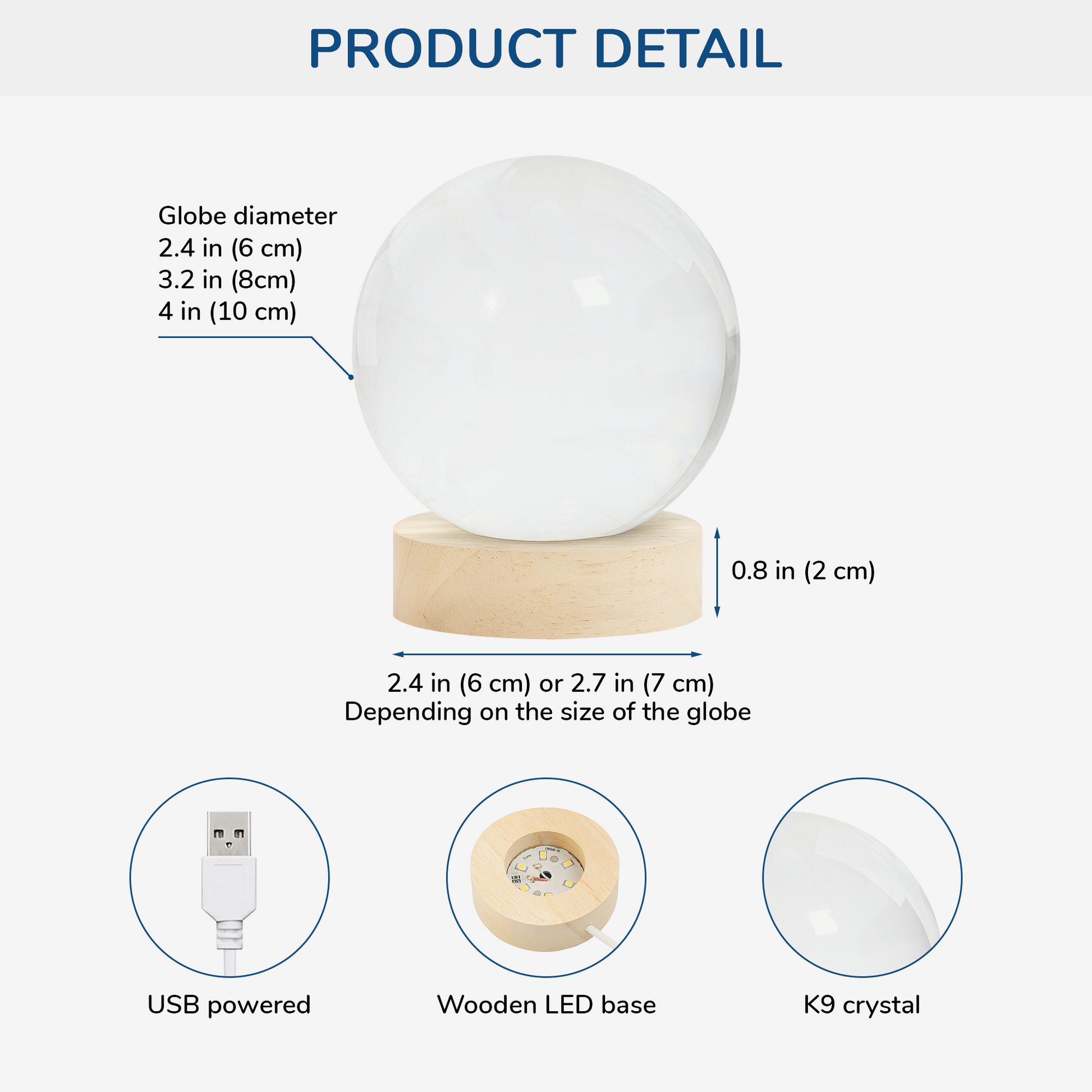 - Material: K5 crystal globe, wooden base, LED light & string