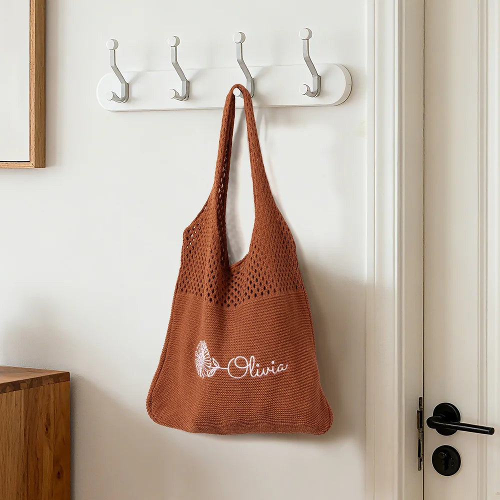 This hand-knitted handbag features a brown hue and a patchwork of openwork and solid pieces. Embroidered with your birth flower and name, it creates a natural and artistic look. Whether for yourself or as a gift, it showcases your unique personality and taste.