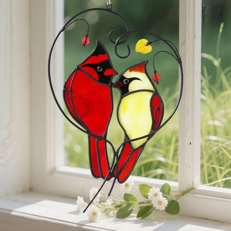 Invite warmth, love, and light into your home with this handcrafted cardinal lovebird suncatcher. Featuring two cardinals perched together, this stained glass artwork transforms sunlight into a radiant, colorful glow ✨. Cardinals symbolize love, loyalty, and connection, making this piece a heartfelt reminder of unity, joy, and enduring affection.